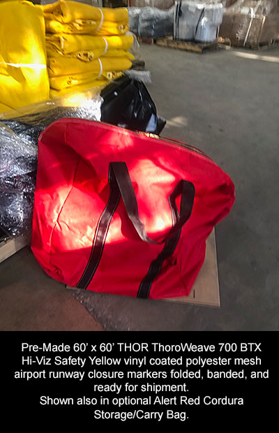 60' x 60' Yellow ThoroWeave 700 Airport Runway CLOSED "X" Safety Marker 10' wide panels of vinyl coated polyester string sewn into a preformed "X" w/ hemmed perimeter & brass grommets @ 3' centers;